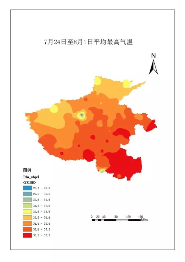 由上两图可看出,河南省除三门峡市、洛阳市中北部、安阳市、鹤壁市、濮阳市外,其他地区平均最高气温在34℃以上,中南部各市、区超过35℃,最高值达37℃左右;日最高气温高于34℃的高温积害量较大的区域出现在中南部,积害量达13度以上,最高值达30。