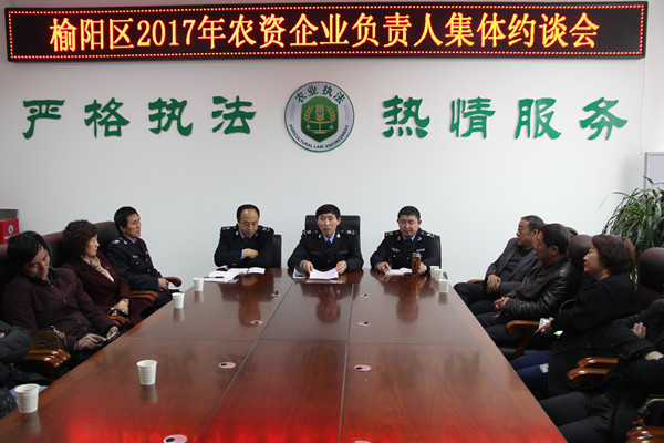 为认真贯彻中、省春季农资打假专项治理行动电视电话会议精神,进一步规范辖区农资生产经营秩序,3月20日,榆阳区农业行政综合执法大队集中约谈了17户重点农资企业负责人。一是提醒种子购销企业、门店严格遵守《中华人民共和国种子法》的有关规定,不得经营应当审定而未经审定(备案)、标签上未标注二维码等违法种子;二是要求企业、门店认真做好种子经营主体备案工作,片区监管执法人员要及时解答经营人员遇到的问题和咨询;三是统一种子经营档案,免费印发《榆阳区农作物种子购销台账》,加强经营各过程管理,落实种子可追溯制度。