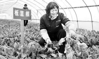 近日,江苏省镇江新区现代农业示范园内的兆丰蔬菜有限公司职工在大棚内采摘“板蓝根”菜。具有清热解毒、健脾止泻等功效的板蓝根不再只是摆在中药铺里,它的嫩茎嫩叶、花、根等经凉拌加工走上餐桌,成为百姓口中佳肴。据了解,该公司从中国农科院引进的新品种“板蓝根”菜,亩产可达750公斤。张斌赵华韦佳摄