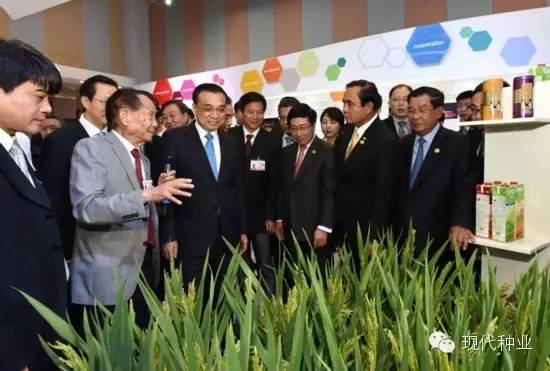 在农业与减贫合作展区,中国“杂交水稻之父”袁隆平院士向各位领导人介绍了现场展出的最先进的杂交水稻品种,并结合有关国家领导人关心的气候条件、土壤环境等做了讲解。看到湄公河国家领导人对中国水稻品种表现出浓厚兴趣,李克强高兴地说,要让中国杂交水稻“走出国门”,助力澜湄国家成为“世界粮仓”。