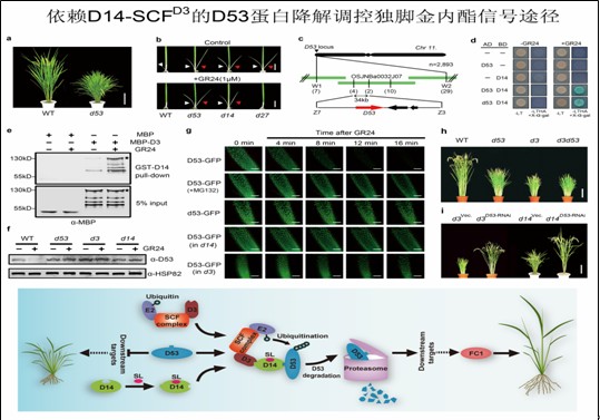 结果表明,d53是一个独脚金内酯不敏感突变体。通过精细定位和图位克隆,他们获得了位于水稻第11号染色体短臂末端的DWARF 53(D53)基因,该基因编码一个新的在结构上与I类Clp ATPase类似的核蛋白——D53蛋白。后续的功能分析发现,在独脚金内酯存在的条件下,D53蛋白可与两个已知的独脚金内酯信号分子D14、D3互作形成蛋白复合体,使得D53蛋白更易被蛋白酶体系统降解,从而诱导独脚金内酯信号的响应,对植物分蘖发挥调控作用。这一结果为通过调控D53基因的表达量,影响独脚金内酯的信号转导,从而对植物分蘖发挥调控作用提供了重要依据。