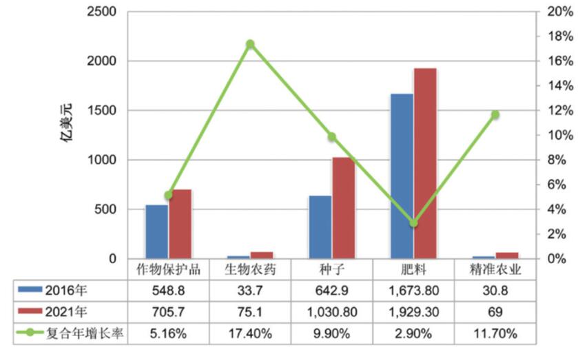 受内外市场因素的影响,从短期及中长期来看,全球农业投入品行业进入小幅下滑及低速增长时期,尤其是传统的植保及肥料领域,未来5年的复合年增长率将保持低位运行,但是对于新兴的生物农药及精准农业来说,未来5年有望进入高速发展期(如图1所示)。