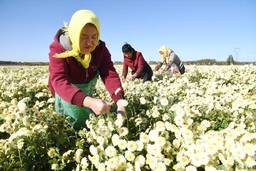 10月29日,河间市景和镇孟庄子村农民在菊花园采摘怀菊。