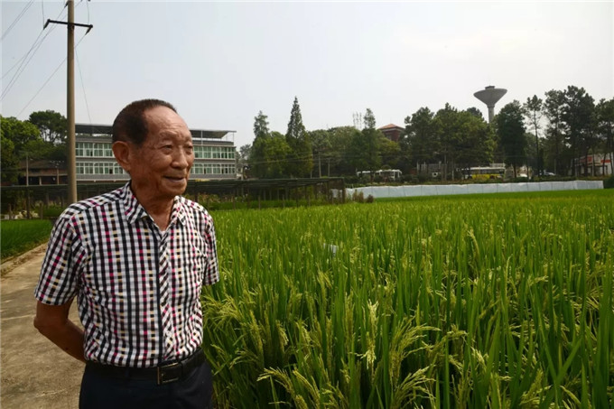 ▲2016年8月17日,袁隆平在位于湖南长沙的实验田里观察超级杂交水稻。来源:新华社