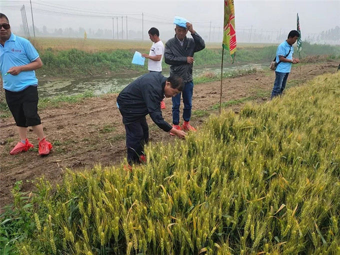 ▲图为麦田边,种植户和种子经销商在查看京麦9号生长情况。