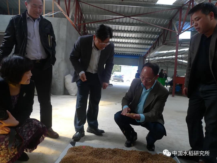 程式华(左四)在浙江富阳帮种粮大户检查种子质量