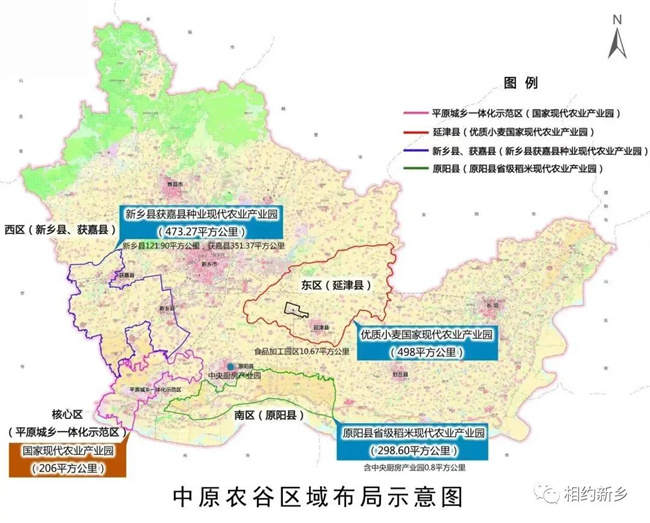 “中原农谷”总体布局为“一核三区”,“一核”就是以种子、种苗、种畜(禽)为主攻方向,打造以种业为突出特征的农业创新高地和农业科技新城的平原示范区。“三区”就是以延津县部分区域为主体的东区,以新乡县、获嘉县部分区域为主体的西区,以原阳县部分区域为主体的南区,总体规划面积1476平方千米。