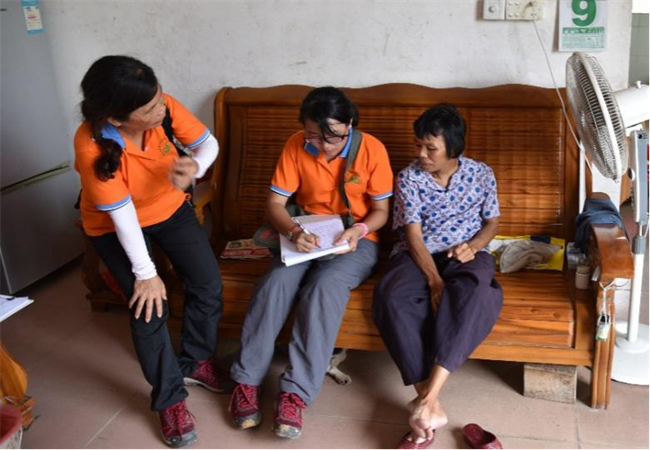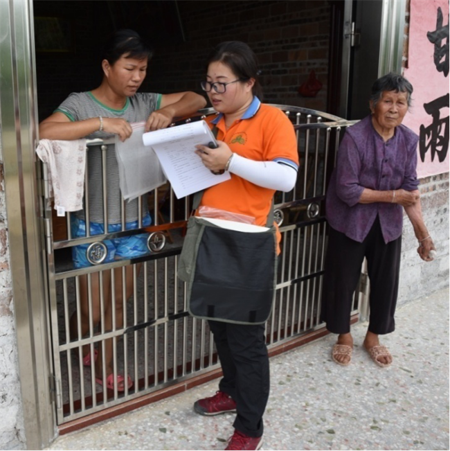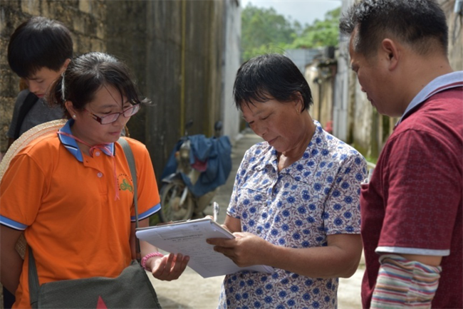吕冰(左一)在恩平县协助信息记录员与农户沟通