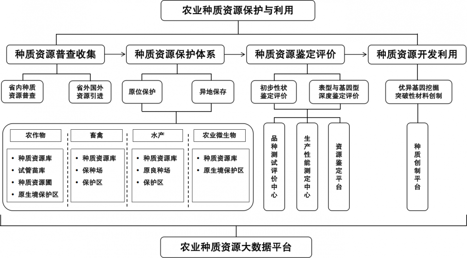 围绕农作物、畜禽、水产和农业微生物种质资源,开展农业种质资源普查收集、保护研究、鉴定评价和创制应用,建成系统完整、科学高效的农业种质资源保护与利用体系,资源保存总量位居全国前列,珍稀、濒危、特有资源得到有效保护,综合开发利用水平显著提升,种质创新达到国内先进水平。