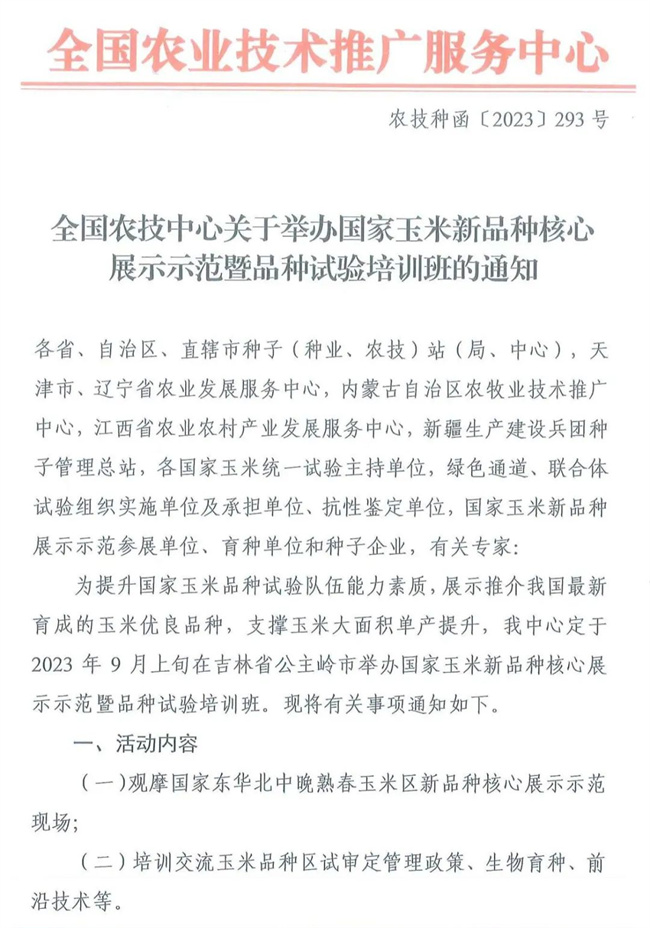 全国农技中心关于举办国家玉米新品种核心展示示范暨品种试验培训班的通知