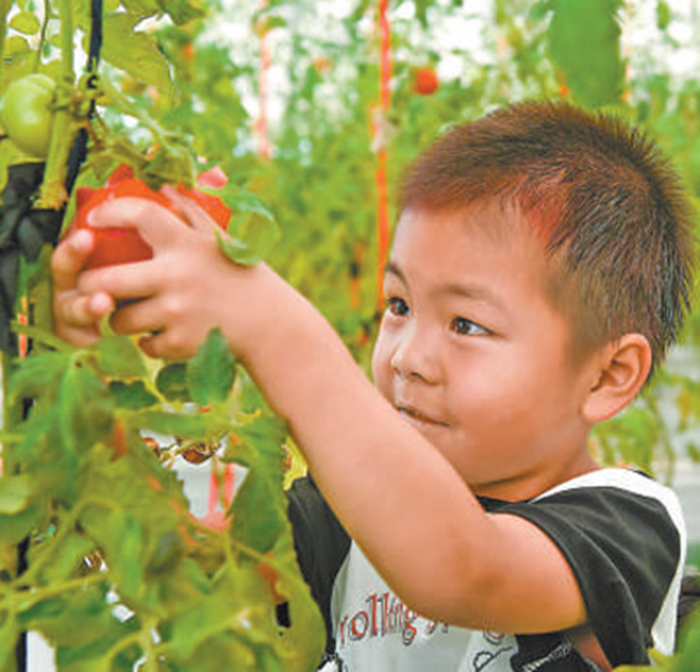小朋友在浙江省宁波市海曙区古林镇茂新村采摘太空西红柿。 胡学军摄(人民视觉)