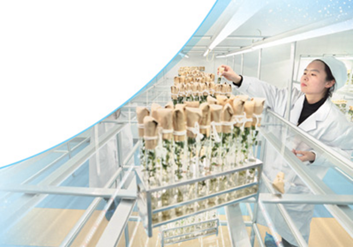 内蒙古自治区商都马铃薯技术创新中心,科研人员在观察太空马铃薯种子组培苗。 贾 鹏摄(影像中国)