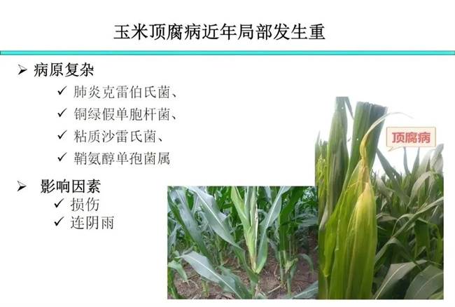 在玉米顶腐病发病初期及时进行药剂防治,可选用80%代森锰锌600倍液或选用10%苯醚甲环唑800倍液施药,用药2次,间隔10-15天。