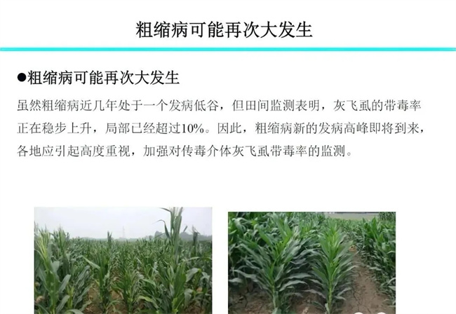 粗缩病多在玉米5-6叶时出现,病苗浓绿,节间缩短,叶片僵直,宽短而厚,植株生长缓慢、矮化。