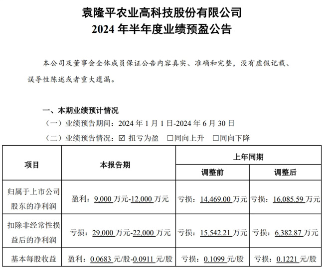 7月8日,隆平高科公布2024年半年度业绩预盈公告。预计2024年上半年净利润9000万元-1.2亿元,同比扭亏为盈。根据公告,上年同期调整后亏损6382.87万元。
