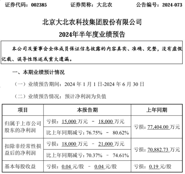 大北农:预计2024上半年净利润亏损1.5亿元-1.8亿元,同比减亏