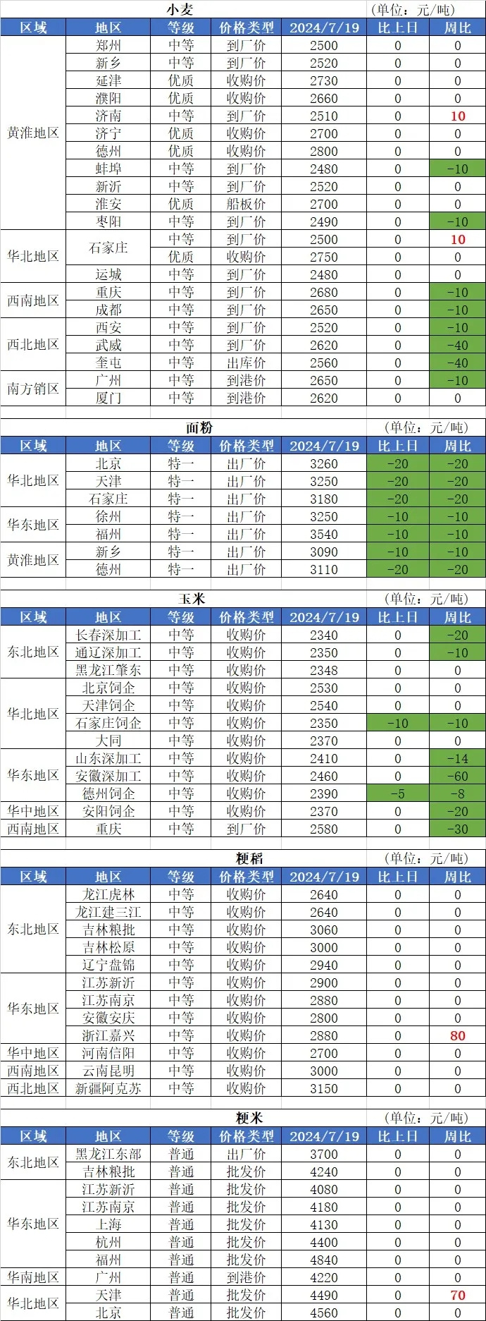 1、7月19日小麦市场整体偏稳运行,局部涨跌调整。其中,河北隆尧今麦郎涨5厘,报价1.24元/斤;山东发达面粉枣庄涨5厘,报价1.262元/斤;菏泽华瑞涨5厘,报价1.255元/斤;潍坊香野涨1分,报价1.27元/斤;河北邢台金沙河跌2厘,报价1.239元/斤。