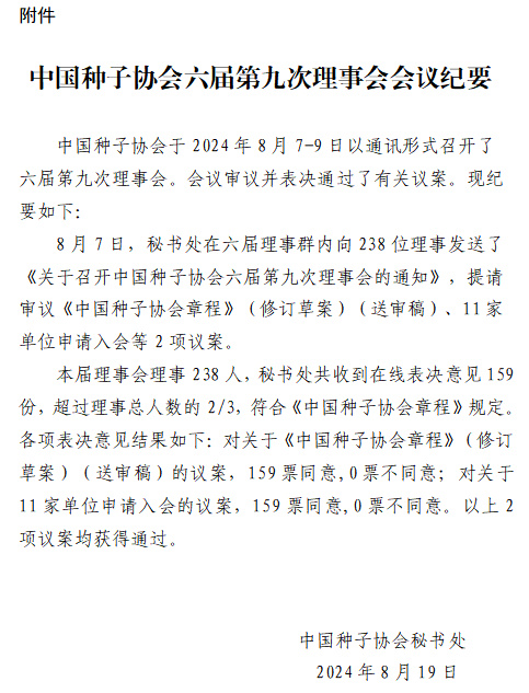 中国种子协会关于印发六届第九次理事会会议纪要的通知