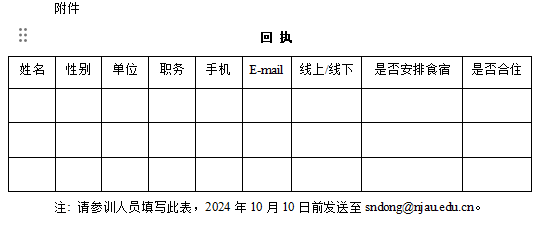 请各省(市、区、县)种业管理部门(种子管理站)将通知转发给辖区内相关单位和部门以及国家种业阵型企业。请参训人员于10月10日前将回执(见附件)以电子邮件发送至sndong@njau.edu.cn,或申请加入QQ群(91233225)报名。会务组将按照收到回执时间先后给予安排,满员为止。