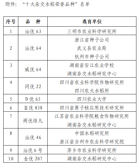 为了充分肯定在我国粮食安全中作出历史性贡献的杂交水稻品种,对袁隆平等老一代科学家表示敬意,激发广大农业科技工作者和种业企业家的创新热情,推动杂交水稻技术的持续进步,在杂交水稻推广近50年之际,中国种子协会组织开展了“十大杂交水稻荣誉品种”评选活动。