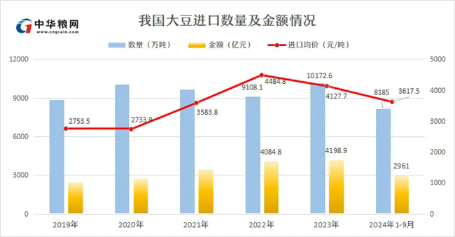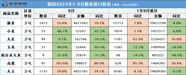 10月18日,海关总署发布最新数据,2024年1-9月我国累计进口粮食量为1.27亿吨,同比增长7.8%;进口金额为3947.1亿元人民币,较去年减少8.8%。
