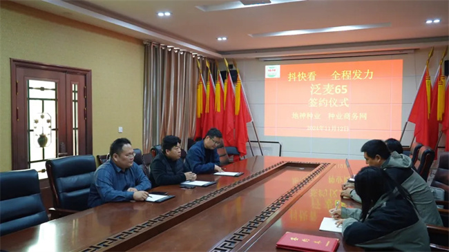 2024年11月12日,河南黄泛区地神种业有限公司与国内头部种业宣传平台种业商务网达成线下推广、线上宣传合作,并在地神种业第二会议室举办了“抖快看 全程发力”泛麦65签约仪式。地神种业副总经理贺华杰,种业商务网主任董伟等出席签约。