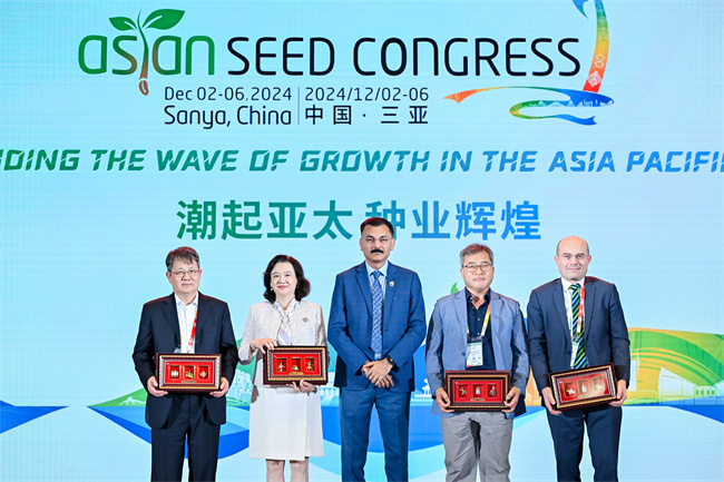 亚太种子协会主席Dr.Manish Patel为卸任的执委杨雅生先生(左一)和