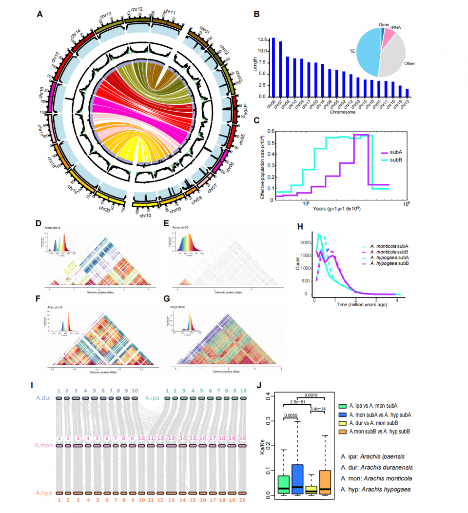 科研团队利用PSMC分析发现,花生的A亚基因组(subgenome A, subA)和B亚基因组(subgenome B, subB)都在大约4000年前发生了有效群体的扩张,这一时间点与最早发现的花生时间相吻合,暗示了该时间可能是花生栽培种四倍化事件发生的时间。进一步对着丝粒区域的研究发现,subB上该区域的重复序列高于subA,但subB上年轻重复序列的比例较少,这表明较慢的重复序列清除速度,而非更多的重复序列插入,是导致subB上该区域重复序列含量更高的原因。此外,subA的着丝粒区域较subB包含了更多的串联重复基因,这些基因的功能主要与蛋白质折叠和运输相关,其育种方面的意义有待进一步挖掘。