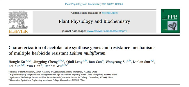 近日,我院植保所农药研究团队在植物保护研究领域国际知名期刊Plant Physiology and Biochemistry(JCR一区,TOP期刊)和Crop Protection(JCR一区)在线发表了题为 “Characterization of acetolactate synthase genes and resistance mechanisms of multiple herbicide resistant Lolium multifforum”和“The synergistic effect and mechanism of different adjuvants on pinoxaden efffcacy against Lolium multifforum Lam”的研究论文。首次发现并报道了我省多花黑麦草对甲氧咪草烟的抗药性,明确了抗性多花黑麦草中ALS氨基酸的突变及多拷贝现象介导了其对甲氧咪草烟的抗药性,解析了抗性多花黑麦草所具有的多重抗性机制。同时,针对多花黑麦草的抗性问题,该团队结合自主研发的除草剂增效剂,报道了通过添加增效剂“喷雾宝”可有效提高唑啉草酯对多花黑麦草的防除效果,并进一步解析了其增效机制,为抗性杂草的防除提供了重要理论支持和实践指导。