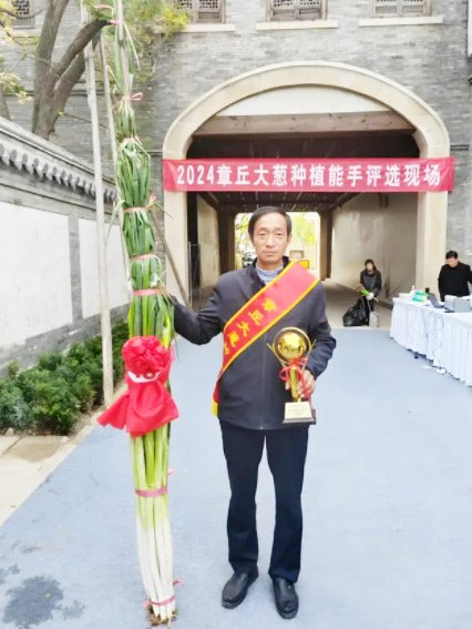 “今年10月左右,我就留意上了,这棵葱格外高。”苗发勇说,“评完的当天就有人给我打电话要葱。”11月9日,在“2024年章丘大葱丰收季”活动中,他种植的一棵高2.68米的大葱打破世界纪录,一举夺魁,成为今年的“葱王”。