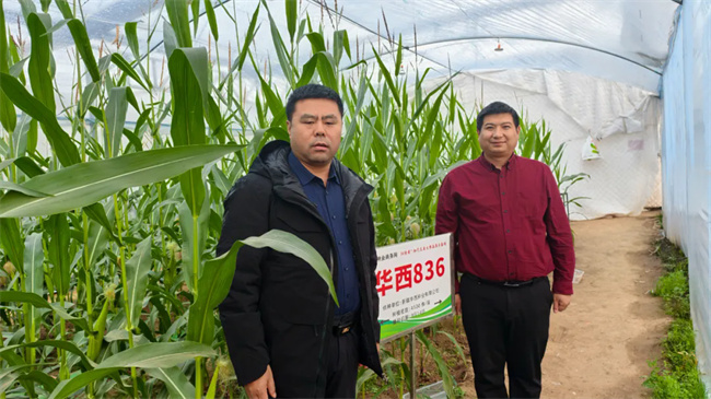 林彦彬一行首先参观加代种植玉米大棚,听取了基地负责人对华西836生长情况的介绍,尤其对技术老师发现华西836的环境钝感能力强这一特性表示大加赞赏。