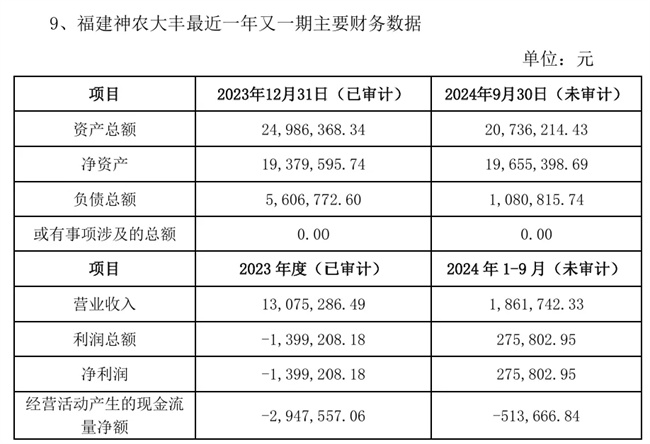 2023年,神农大丰种业营业收入约1300万元,净亏损约140万元。在2024年,截至9月30年,营收仅约186万元,净利润约27.5万元。