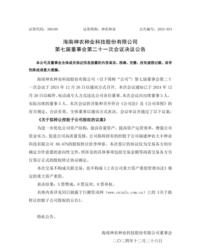 12月26日,上市种业企业海南神农种业科技股份有限公司(简称“神农种业”)披露公告称,公司拟将持有的控股子公司福建神农大丰种业科技有限公司(以下简称“神农大丰”)88.67%的股权转让给李坤泰。