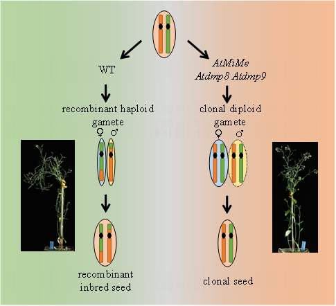 研究团队以不具备无融合生殖特性的双子叶模式植物拟南芥为研究对象,通过人工杂交创制了杂合背景的拟南芥材料,在该杂合材料中同时敲除了减数分裂和受精过程的关键基因,并最终形成克隆种子和后代。通过多种技术证实在该材料自交产生的后代中,存在细胞核基因组倍性、全基因组基因型和其母本完全一致的个体。随后的自交传代研究发现,这些克隆植株仍然能持续产生倍性和基因型完全一致的克隆后代,表明无融合生殖特性被成功引入到拟南芥中。该研究证实了通过人工设计引入无融合生殖特性从而实现双子叶杂交植物自繁种的可行性,为在更多双子叶植物中开展人工无融合生殖固定杂种优势研究提供重要借鉴。
