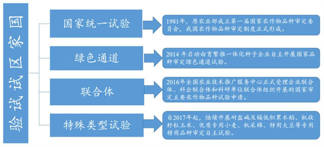 在国家层面,我国三次修订《主要农作物品种审定办法》,开通了绿色通道、联合体等自主试验渠道,进一步优化了品种审定工作程序。制定发布国家审定品种同一适宜生态区文本,启动实施省际间引种备案工作。优化各渠道试验审定品种编号规则,进一步加强了各渠道审定品种标识管理。制定《国家主要农作物品种试验管理办法》,进一步强化品种审定试验全流程规范化管理。