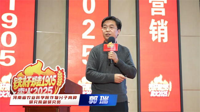 河南省作物分子育种研究院、许为钢院士育种团队成员郭瑞介绍了郑麦1905的选育背景及选育过程。他说,郑麦1905高抗条锈、中抗纹枯等主要病害,抗倒好,稳产高产等特点非常符合当前生产需要,相信在大家共同努力下,发挥优良品种优势,为农民增产增收、农业增效,经销商获得更大回报做出更大贡献!
