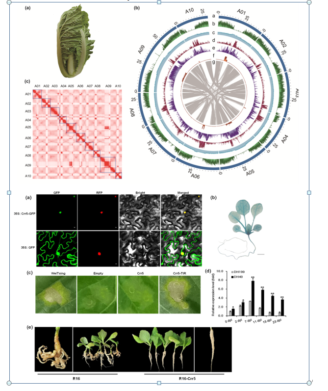 该研究利用游离小孢子培养创制了抗根肿病大白菜DH系DH40,然后利用PacBio HiFi、Hi-C和Illumina HiSeq等技术组装了染色体水平的基因组。以DH40基因组为参考序列,成功精细定位了抗性基因Crr5,其候选基因DH40A08G013380编码抗病蛋白,含有典型的TIR-NBS-LRR结构域。序列比较发现Crr5基因序列在感病材料DH199与抗病材料DH40间具有多处差异,最重要的是在第3个外显子一个T碱基的插入导致了翻译提前终止。异源表达Crr5使拟南芥具有根肿病抗性,亚细胞定位显示Crr5定位在细胞核,GUS染色分析表明Crr5在根和叶中均表达,且在根茎结合部位表达量最高,qRT-PCR分析表明Crr5在抗病材料DH40中表达量显著高于感病材料DH199,功能结构域分析表明Crr5全长不能引起cell death超敏反应,但其TIR结构域可以。最后,还开发了基因特异功能标记Crr5-funK3,以该标记选择为前景通过标记辅助选择成功创制了抗根肿病新种质。本研究为白菜类作物的遗传和基因组学研究提供了宝贵的资源,加深了我们对大白菜根肿病抗性机制的理解,具有重要的理论和实践意义。