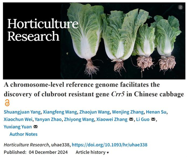 近日,我院蔬菜所张晓伟创新团队联合北京大学现代农业研究院郭立团队在大白菜根肿病抗性基因挖掘与利用研究方面取得新进展,相关研究成果以"A chromosome-level reference genome facilitates the discovery of clubroot resistant gene Crr5 in Chinese cabbage"在园艺学顶级期刊 《Horticulture Research》(中科院1区,Top期刊,IF 7.6)在线发表。