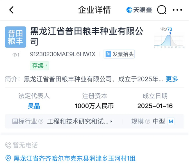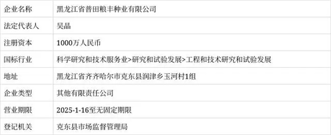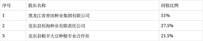 1月16日,黑龙江省普田粮丰种业有限公司注册成立,法定代表人为吴晶,注册资本1000万元人民币,该公司由黑龙江省普田种业集团有限公司、克东县恒海种业有限责任公司、克东县粮丰大豆种植专业合作社持股,分别持股51%、27.5%、21.5%。