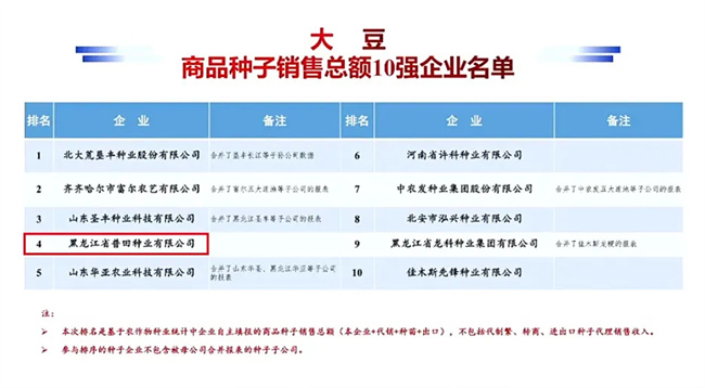 2024年的第二十一届全国种子信息交流会上公布了最新的种业企业排名,普田种业再度脱颖而出,连续6年进入常规水稻商品种子销售总额前10,大豆商品种子销售总额步入前5。