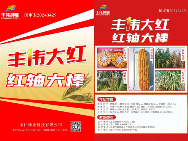 丰伟大红,是一款红轴大棒型玉米品种,颜值高,卖点多。该产品棒大穗长行数多,籽粒宽大金黄、品质优良。加上脱水较快,卖棒卖粒皆宜,效益转化用途更广,更满足种地大户粮食储存的需求。而且机收不掉粒,丰伟大红,籽粒排列整齐、紧密,苞叶在玉米成熟后自动蓬松,有利于脱水和机器的采摘,在一定程度上保证了玉米的产量。
