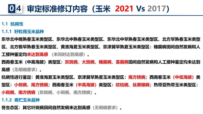 近年来,除农业农村部种业管理司常态化推进品种审定绿色通道、联合体试验整治和“仿种子”清理工作外,2021年修订的玉米审定标准的变化,对审定的品种质量提出了更高要求。启动撤销品种审定,退出一批种性退化失去生产应用价值品种、风险问题品种。对比2017年玉米审定标准,2021年修订带来哪些变化?
