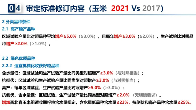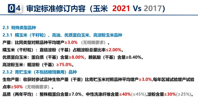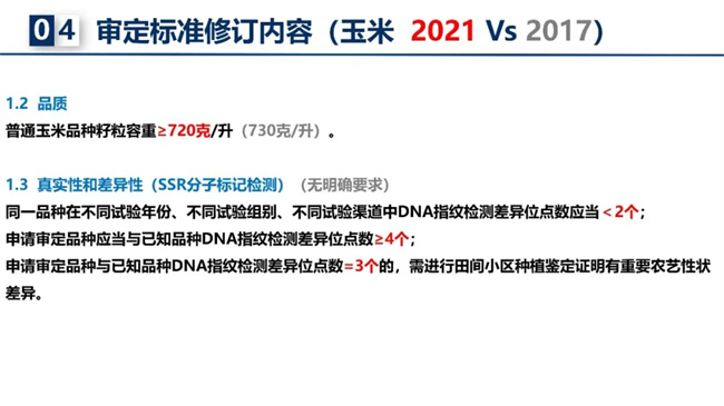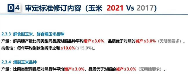 2021年国家级玉米品种审定标准重点针对三个方面的内容进行了修订。一是明确品种DNA指纹差异要求。将玉米审定品种与已审定品种DNA指纹检测差异位点数由2个提高至3个;如果拟审定的玉米品种与已审定品种DNA指纹检测差异位点数只有2个或3个,须通过田间种植鉴定证明其与已审定类似品种具有重要农艺性状差异。二是提高品种产量要求。玉米高产稳产品种,产量指标整体提高2个百分点。明确玉米绿色优质品种、鲜食、青贮等专用特用品种产量指标,比同类型对照品种增产3%以上。三是提高抗病性要求。增加主要生态区一票否决病害类型和病虫害鉴定内容,提高已有病害抗性要求。此外,还修订了鲜食玉米、青贮玉米、高淀粉玉米等特殊类型品种品质指标。