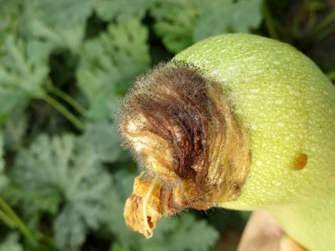 该病常从花蒂部侵入幼果,并向果实扩展,发病初期花和幼果发生水渍状湿腐,病花变褐腐烂。例如,西葫芦感染花腐病后,病原菌先从花蒂部侵入幼瓜,然后向上扩展,致病瓜外部逐渐褐变,表面可见白色茸毛状物在瓜毛之间蔓延,湿度大时长出白色至灰色孢囊梗和黑色头状物,似大头针状颗粒。当遇到适宜的环境条件,病情扩展迅速,干燥时半个果实变褐,失去食用价值。