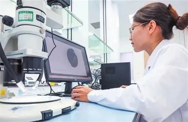 在崖州湾种子质量检测平台(ISTA实验室),实验人员在显微镜下对种子进行鉴定。