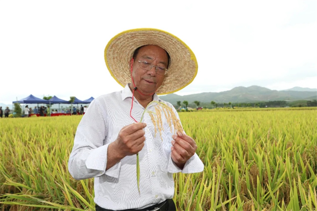 中国科学院院士谢华安在崖州区坝头南繁公共试验基地查看稻谷长势。