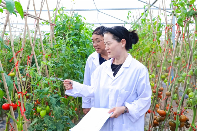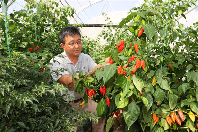 中国农业科学院研究员王立浩在位于崖州区的中国农业科学院国家南繁研究院辣椒种植基地查看辣椒长势。