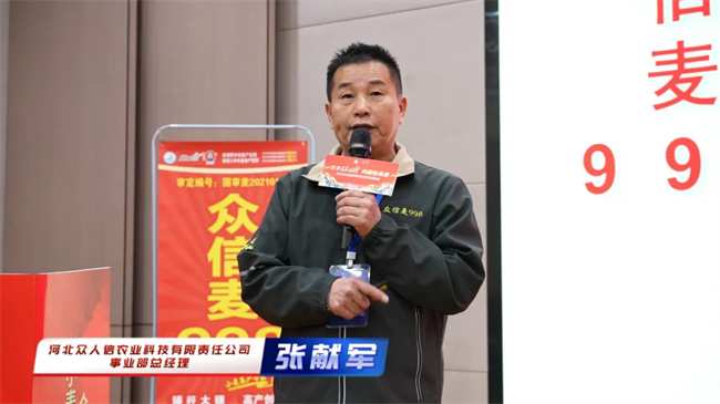 保定市农业农村局种植业科一级主任科员张云涛讲话中指出,众信麦998品种具有诸多优良特性,包括高产稳产、抗倒伏、抗病害性能突出等,这些特性使其在当前的农业生产中具有重要的推广价值。他强调,希望各位经销商朋友积极配合各级农业技术推广部门,加强对该品种种植技术的宣传与指导,确保农户能够掌握正确的种植方法,发挥优良品种更大的社会价值,为保障粮食安全、促进农民增收做出积极贡献。