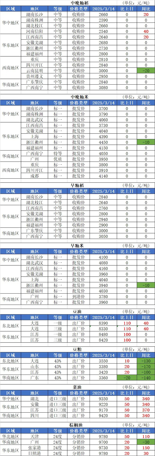 2、3月14日,部分深加工企业调整玉米收购报价,其中山东寿光金玉米收2294元/吨,较昨日下跌10元/吨;山东保龄宝玉米挂牌价2280元/吨,较昨日下跌10元/吨;黑龙江绥化昊天玉米干粮收2065元/吨,较昨日涨20元/吨。