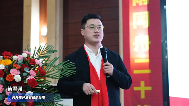 在庆典的高潮部分,战略布局成为核心亮点。同舟缘种业营销部苗雪强经理从七大方面深入阐释了公司始终秉持的“同舟共济,和谐共赢”经营理念。他详细解读了公司在市场运作思路、宣传营销规划以及市场营销目标等方面的战略规划。在发布的同舟缘种业创富战略暨“创富520计划”中,苗经理指出,公司经过过去10余年在科研领域投入了大量的人力、物力和财力。凭借这些积累,同舟缘种业将在2025年后持续推出更优秀的品种。展望未来,公司计划在2030年之前,在黄淮海区域重点扶持一批深度合作伙伴,打造20个年销售利润500万元以上、50个年销售利润200万元以上的深度战略合作伙伴。通过携手共进,同舟缘种业将与合作伙伴共享种业创新发展的红利。